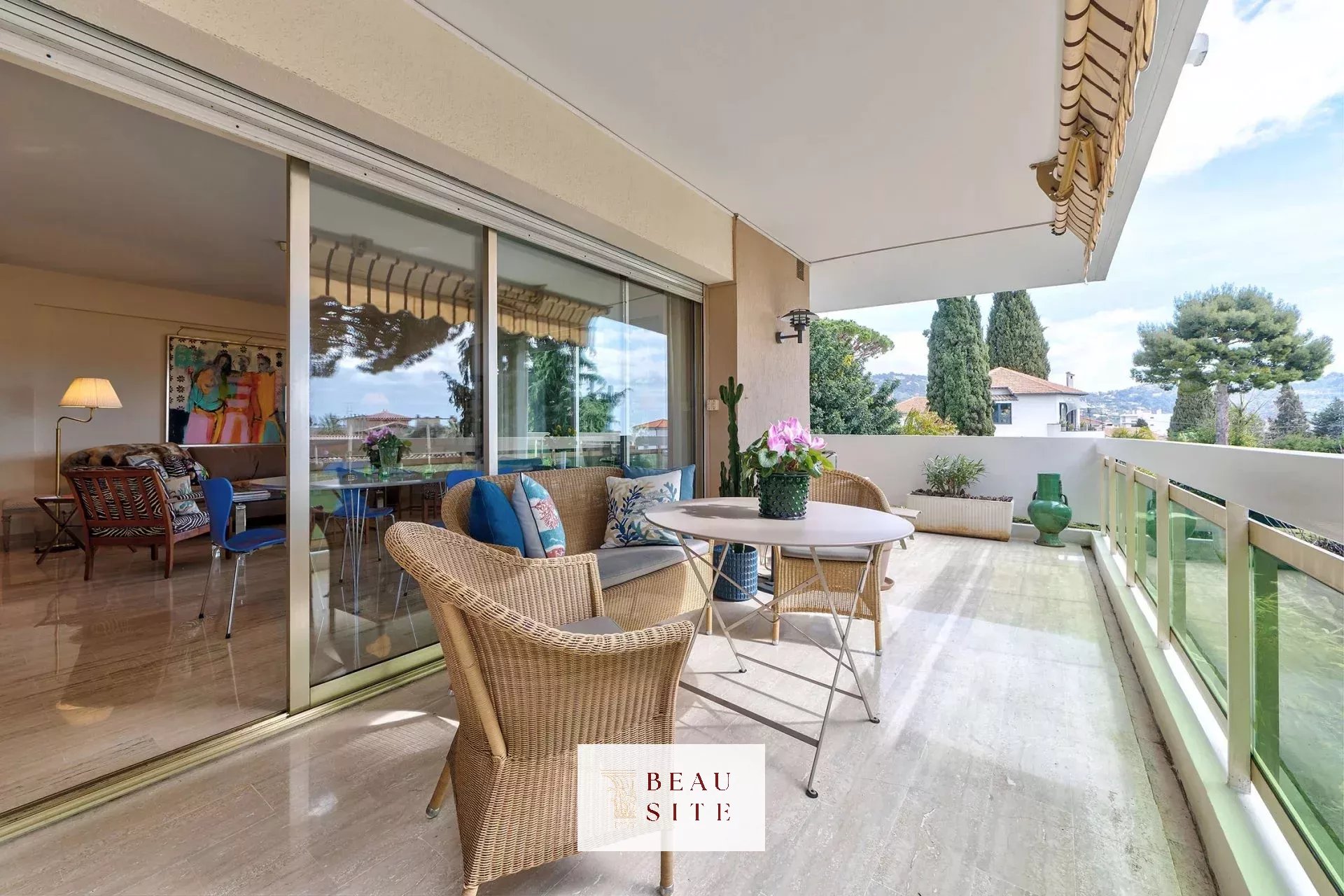CANNES PETIT JUAS : Appartement 4p avec grande terrasse et aperçu mer Appartement de 109 m² avec une grande terrasse de 60 m², une belle vue dégagée et un aperçu mer, niché au sein d'une résidence paisible avec piscine. A environ 5 minutes en voiture du centre de Cannes. L’appartement, au 1er étage, est en très bon état avec des prestations haut de gamme et se compose d’un spacieux séjour, d’une cuisine indépendante, de 3 belles chambres dont une en suite, ainsi que d'une salle de douches. 2 places de parking dans le garage et une cave.
