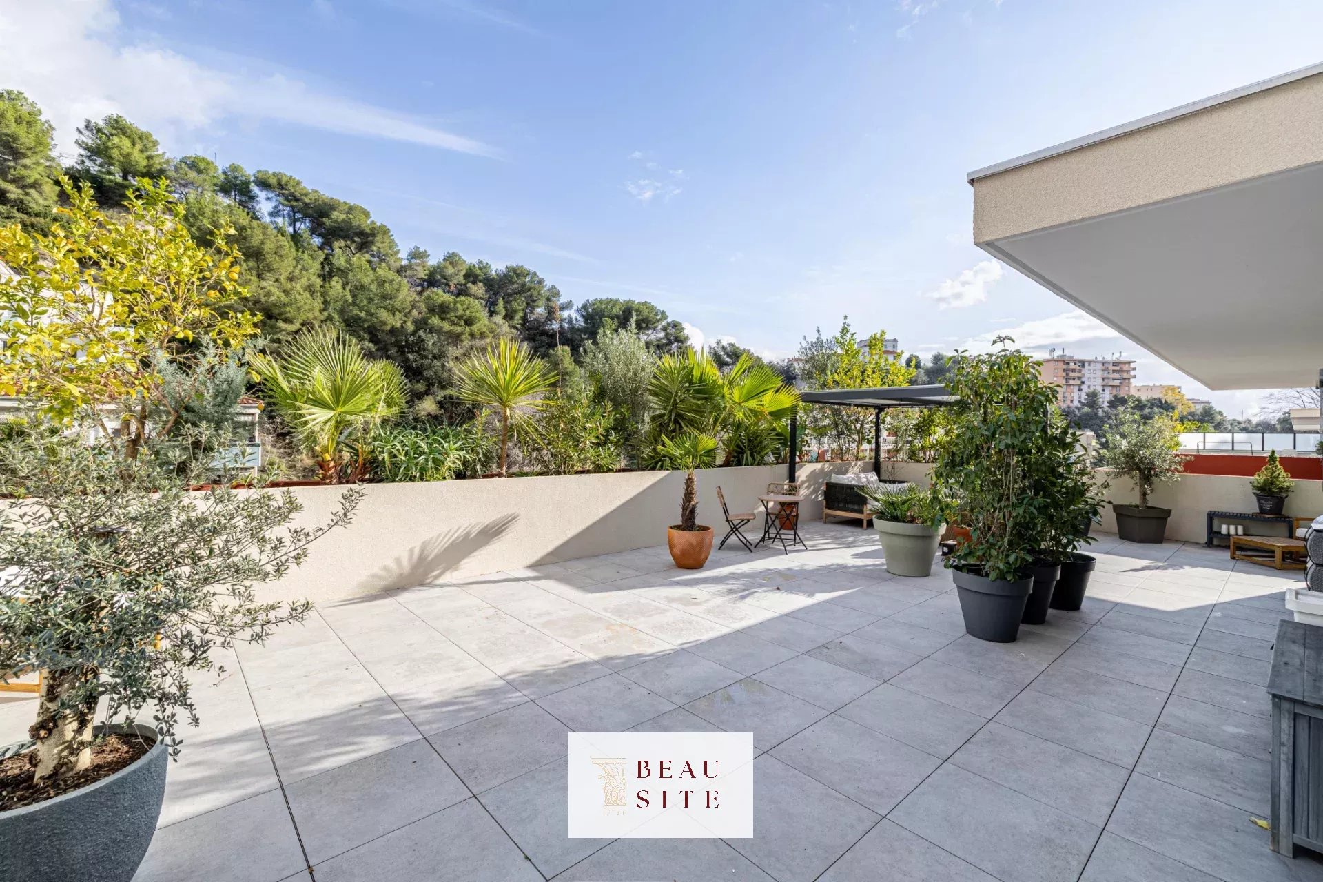 Pessicart: Dans résidence récente sécurisée, magnifique toit terrasse de 97m2 habitables et 100 m2 de terrasse ensoleillée, vue dégagée, cave et double garage possible en sus.